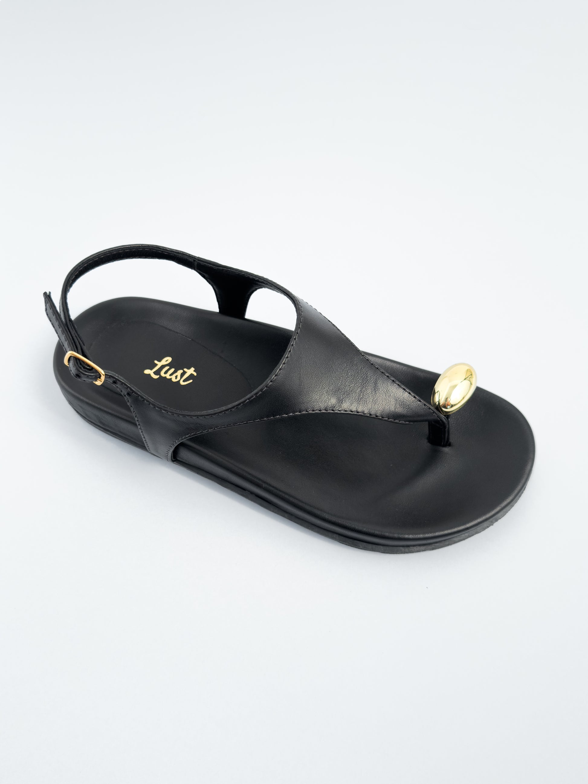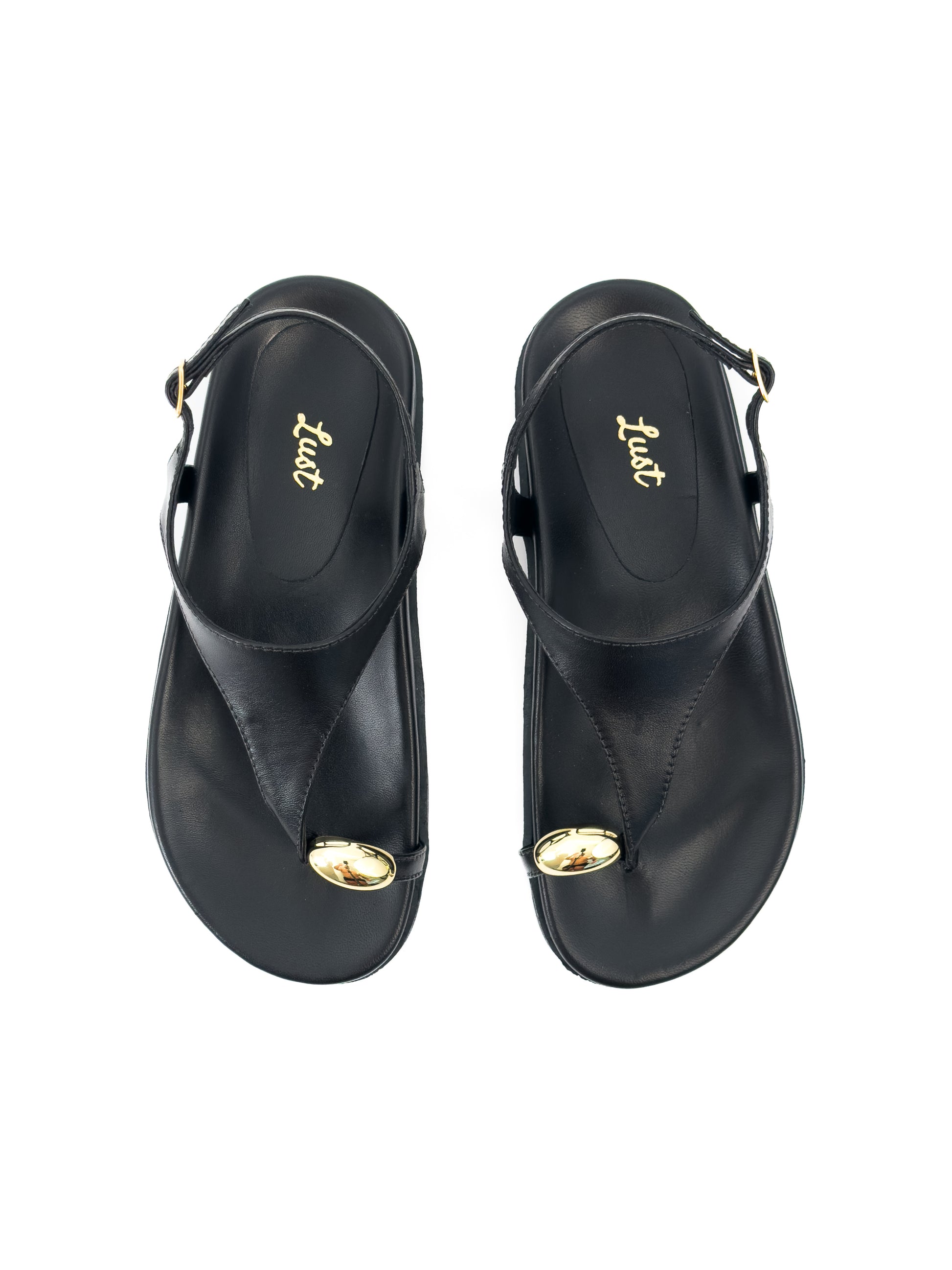 Com tiras amplas em couro legítimo e fechamento com fivela dourada, ela combina ajuste seguro e elegância natural. O detalhe frontal metalizado adiciona um toque de brilho discreto, elevando o visual com sutileza.